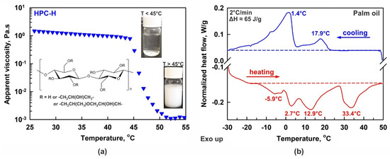 (a) Temperature dependence of 2 wt. % HPC-H aqueous solution viscosity. Below ca. 45 °C the solution is transparent and jelly-like, whereas the polymer precipitates and the viscosity decreases at higher temperatures. Inset: pictures of bottles filled with solution and general chemical structure of HPC. (b) DSC thermogram of bulk palm oil. The experiment was performed at 2 °C/min rate. The phase transition enthalpies measured upon both cooling and heating are in excellent agreement with each other, ΔH ≈ 65 J/g. The temperatures noted on the figure show the peaks maxima.