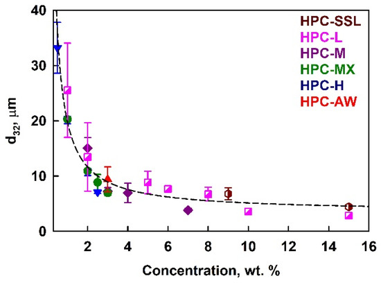 These findings highlight significant differences in the properties of the studied HPC polymer grades. The observed variations suggest that the behavior of the emulsions stabilized with these polymer solutions could strongly depend on both the polymer concentration and the specific type of HPC used.