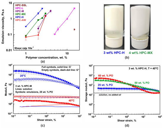These results highlight the potential of the high-molecular-mass HPC polymers for the preparation and stabilization of triglyceride oil emulsions, even when the drops contain both solid and liquid oil fractions. Emulsions stabilized with HPC remained entirely stable at 40 °C for at least one month when prepared with HPC-M at C ≥ 3 wt. %, HPC-MX at C ≥ 2 wt. % and HPC-H at C ≥ 2 wt. %; see Table 2 and Figure 5a. Furthermore, at lower temperatures these samples were non-flowing gels, allowing fine-tuning of the desired rheological behavior, depending on the specific emulsion application.