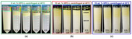 The formation of a bulk oil layer, resulting from drop–drop coalescence during centrifugation, is also observed at the highest HPC-L concentration studied, 15 wt. %. For this sample, even after 4 h of centrifugation at 40 °C, the lower phase remains turbid, indicating the presence of numerous emulsion droplets, scattering light in the aqueous serum. However, the amount of separated bulk oil after 4 h becomes comparable to that observed at the lower HPC-L concentration, cf. Figure 6a,b. When the same experiment is performed at 25 °C, as shown in Figure 6c, similarly to the experiments conducted under a gravitational field, a yellowish layer of partially coalesced drops appears on top of the emulsion, while no bulk oily layer is observed to separate. However, upon heating, the coalescence is enabled and proceeds. A comparison of the centrifugation results for several additional samples at 25 °C is presented in Figure S7 in the Supplementary Materials.