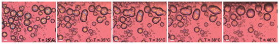The second type of model optical experiment was performed using an emulsion sample, prepared with the procedure described in Section 4.2.4, with palm oil dispersed in 1 wt. % HPC-SSL. After preparation, the emulsion sample used for optical observations was diluted with 1 wt. % HPC-SSL and transferred into a rectangular glass capillary. The sample was then stored at 25 °C overnight to facilitate the drop crystallization. Afterwards, this sample was heated at a rate of 5 °C/min under an optical microscope. Figure 10 presents the illustrative results from this experiment. As seen from the images, all drops initially appear as distinct spherical entities, part of which are in contact with one another. Upon heating, the solid bridges connecting neighboring droplets begin to melt, leading to drop–drop coalesce. Eventually, the particles completely melt, forming liquid drops with diameters significantly larger than those of the initial particles.