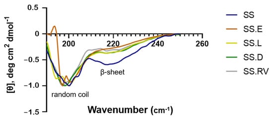CD of SS solution after extraction in boiling water (SS) and after concentration using different methods (SS.E: evaporation, SS.RV: rotary evaporation; SS.L: cryo-lyophilization; SS.D: dialysis). The data shown represents the average of 3 readings.