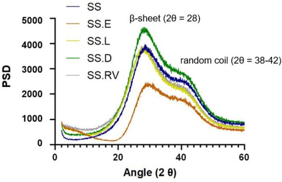 Contrary to SS solutions obtained through boiling water, SS after HTHP exhibits a broad diffraction peak at 2θ ≈ 20 that indicates the conversion of the random coil structure into the β-sheet structure [58]. Differences in HTHP SS after different processing methods result in differences in crystallinity, as reported by Rocha et al. [59]. After freezing at −86 C, the resulting lyophilized powder exhibited increased crystallinity in X-ray diffractograms. As X-ray diffractogram patterns of SS after extraction in boiling water and SS.L displayed the same behavior, no conformation changes were registered, in line with the CD [59].