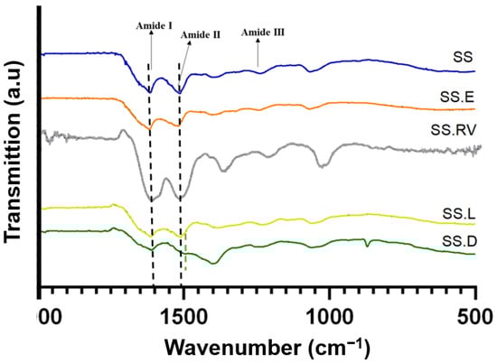 Typical absorption bands in the SS protein, such as amide I (1600–1700 cm−1), II (1504–1582 cm−1), and III (1200–1300 cm−1) [8,60] were detected for all samples at around 1649 cm−1 (C=O stretching in carbonyl group within amidic backbone), and 1528 cm−1 and 1238 cm−1 (phenolic hydroxyl functionalities of tyrosine residues of SS) [61]. The peaks at 1395 cm−1 can be attributed to C=O symmetry stretching, and peaks at 1067 cm−1 can be attributed to C-O-C and C-O stretching vibrations [62]. The peak at 2989 cm−1, observed for SS after extraction and concentration using rotary evaporation (SS.RV) and dialysis (SS.D), can be attributed to the C-H stretching vibration [62].