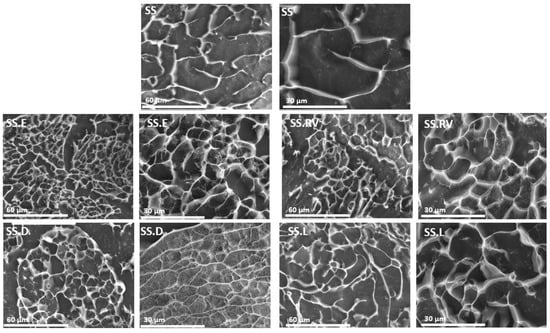 The morphology of the SS processed under varying conditions was analyzed through Cryo-SEM (Figure 4). All protein-based hydrogel structures can generate porosity after water removal [68,69], which increases with a decrease in protein content (SS.E, SS.RV, SS.D, and SS.L). The effect of SS concentration on the final porosity was also reported in the work of Tao et al. [70], which additionally showed that lower freezing temperatures resulted in a bigger average pore size and density [70]. Contrary to silk fibroin, which results in oriented and organized structures after freeze-drying, the structure of SS for most of the tested samples did not follow a specific pattern, owing to its amorphous nature [51]. However, for the SS.D condition, portions of the sample adopted a more aligned structure (Figure 4).