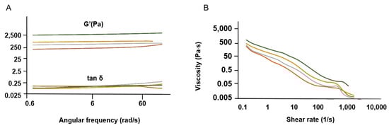 The curves obtained are representative profiles of a hydrogel matrix in which tan δ < 1, which indicates that G′ > G″ (Figure 5A), consistent with a material that behaves like an elastic solid [72,73]. The SS gelation phenomenon was preserved, even at low concentrations (1 wt. %), after the different concentration methods [74]. This was an interesting finding, as HTHP extraction affects the gelling properties of SS, with a minimum concentration of 3 wt. % being required for gel-like behavior [75].