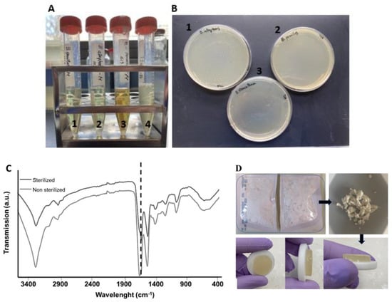 (A) Turbidity results after 12 days for 1: sterilized B. pumilus; 2: sterilized B. atrophaeus; 3: sterilized B. stearothermophilus and 4: non-sterilized B. pumilus (positive control); (B) Culture of the medium collected from the turbidity tests and incubated during 2 days in TSA plates (1: B. atrophaeus; 2: B. pumilus; 3: B. stearothermophilus). (C) ATR.FTIR spectra of lyophilized SS before and after sCO2 sterilization, in which the amide I peak position was maintained (dashed line). (D) SS raw material in sterilization pouches before sCO2 and after dissolution in PBS (2 wt. %).
