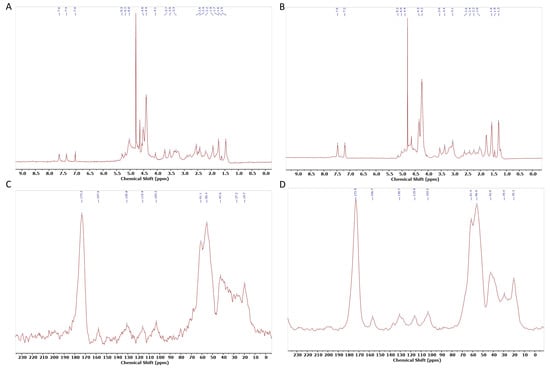 NMR analysis of (A); SSL 1H-NMR S, (B); 1H-NMR commercial SS (C); 13C CP-MAS SSL (D); SSL D: 13C CP-MAS commercial SS.