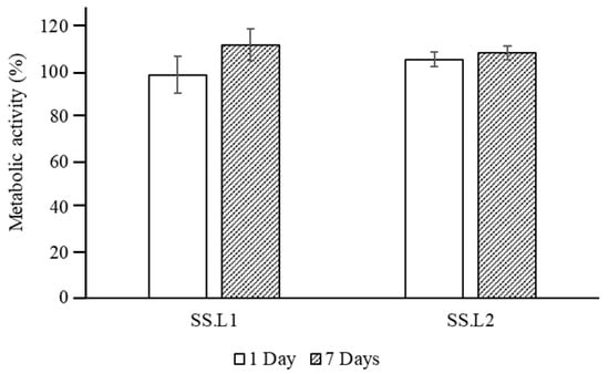 Normalized metabolic activity of HDFs cultured using extracts of SS.L1 (1 wt. %) and SS.L2 (0.5 wt. %) collected after 1 and 7 days (n = 8).