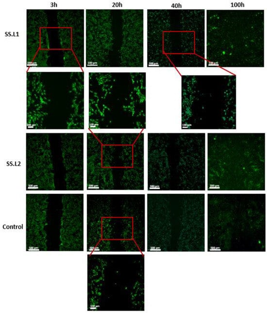 Fluorescence images collected for the wound-healing assay after 3 h, 20 h, 40 h, and 100 h for SS.L1, SSL2, and control groups (magnification 10× and 40×) (n = 3).