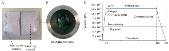 Concerning the sterilization phase, which is essential for both in vitro and in vivo testing, supercritical CO2 (scCO2) is gaining increasing attention as a sterilization agent able to inactivate vegetative forms of a wide range of Gram-positive and Gram-negative bacteria [35]. The mild operating conditions, low content of additives required, and excellent scCO2 permeability are clear advantages for the sterilization of biomaterials for biomedical applications [36]. The sterilization capability can be enhanced by incorporating small quantities of additives such as hydrogen peroxidase (H2O2). A previous work by our team demonstrated that this technology can be successfully applied to silk proteins [37].