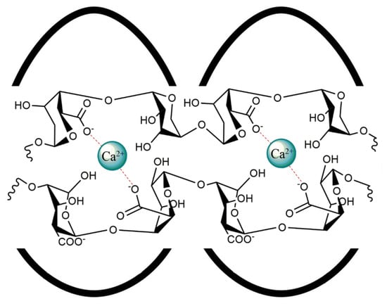 The most common method used to prepare alginate microgels is ionic cross-linking in the presence of divalent cations, such as Ca2+. Alginate is formed by guluronate (G) blocks and mannuronate (M) blocks. In general, the gel structure is obtained thanks to the G blocks. The G blocks, having a high degree of coordination with the divalent ions, form junctions with the G blocks of the adjacent polymer chains in what is defined as the egg-box cross-linking model (Figure 1) [25].