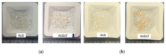 ALG and ALG:Lf microparticles in (a) swollen (after synthesis) and (b) freeze-dried form.