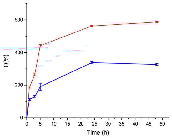 The swelling experiments were performed on freeze-dried ALG and ALG:Lf microparticles. In a typical test, the sample was immersed in 3 mL of Millipore water. At different time intervals (4, 24 and 48 h), the sample was extracted, and its weight was carefully determined after removing excess water from the surface by wiping with Whatman filter paper (Sigma Aldrich, Milan, Italy) [35]. Q (%) was calculated using Equation (10).