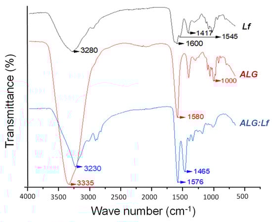 FT-IR spectra are reported in Figure 5. In the ALG spectrum, the vibrational stretching of O–H bonds is observable in the range of 3600–3000 cm−1, centered at 3335 cm−1. Furthermore, the characteristic peaks of the stretching of the carboxyl (-COOH) and ether (C–O–C) groups are observable at 1580 and 1000 cm−1, respectively. The Lf spectrum shows the characteristic amide bands I, II, and III observed at 1600, 1545, and 1417 cm−1, respectively. Furthermore, free -OH groups of amino acids can be identified from the band at 3280 cm−1 [27]. The spectrum of ALG:Lf shows the signals of both polymers, particularly the bands at 3230, 1576, and 1465 cm−1, attributable, respectively, to the free O-H groups of the amino acids [28], the stretching of the N-H group, and the stretching of the C-N and N-H groups. The displacement of 4 cm−1 at 1576 cm−1 (amide I) is noteworthy compared to the value for lactoferrin, which can be attributed to the association between the negatively charged groups (-COO−) of alginate and the positive ones (-NH3+) of Lf [29].