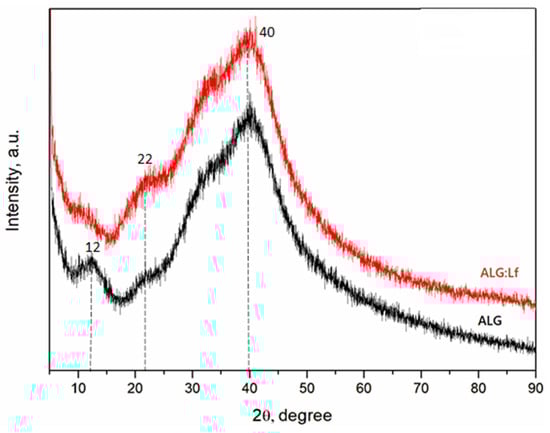 XRD pattern of calcium-alginate beads (ALG, black curve) and Lf-loaded calcium-alginate beads (ALG:Lf, red curve).
