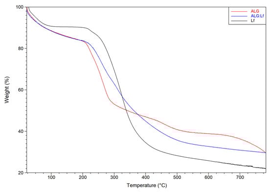 TGA curves of Lf, ALG, and ALG:Lf microparticles.