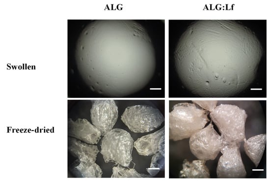 The morphological analysis of the ALG and ALG:Lf microparticles was preliminarily performed by optical microscopy observations for both the swollen and freeze-dried samples, and the images are shown in Figure 8. For both swollen microgels, no significant differences in size (about 3 mm) were observed, aside from the rougher surface of the microgels. In the case of the freeze-dried particles (size of about 2 mm), a different color was observed; the ALG:Lf particles appear more consistent and orange-colored than the colorless ALG ones.