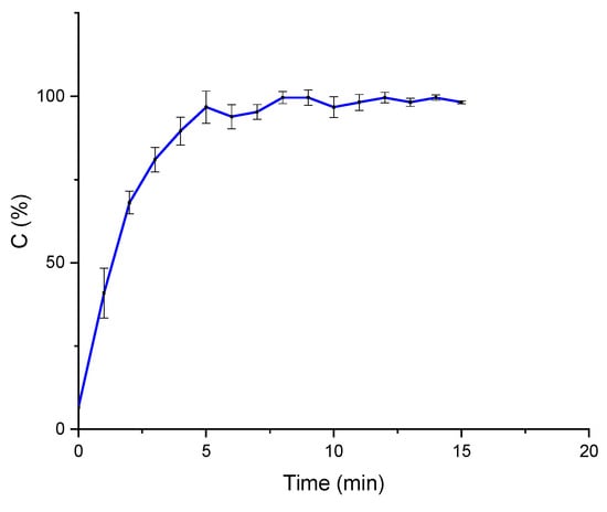 The swelling model is needed to understand how particles swell over time from the calculation of the swelling constant (kv). At zero time (t = 0), the particle is considered a dry solid (Vads = 0). The liquid’s penetration into the dry particle occurs with swelling, which decreases over time. Moreover, the acidic environment used led to the polymer chains opening with the dissolution of the microparticle’s external shell. The aqueous solution penetrates the particle, which swells up to a maximum swelling volume (Vmax). The swelling rate is a function of time, and it linearly depends on the swelling constant (kv) and on the volume difference between the maximum swelling volume and the variable adsorbed volume over time. The swelling measurements are given by the ALG:Lf sample particles at various times: 0, 1 min, 3 min, 5 min, 24 h, and 48 h. The adsorbed volume change over time is expressed by the following differential equation: