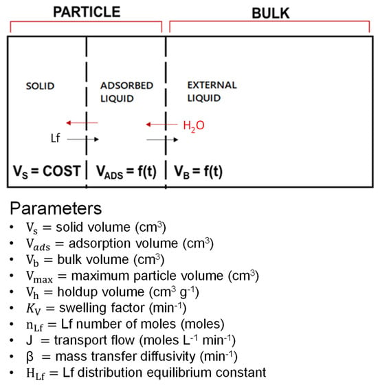 This model assumes that the bulk solution penetrates the microparticles and swells them; simultaneously, the Lf inside the particle matrix diffuses outside towards the external bulk solution. In the described mathematical model, two possible limiting effects are considered. The first one is due to the stagnant liquid layer adherent to the solid inside the microparticle, described by the solid–liquid (liquid-side) mass transfer coefficient (βsl). The second one is due to the resistance to mass transfer located at the two-liquid interface (adsorbed liquid and external liquid). A rigorous treatment would require a two-film approach [34], but, in our case, we have simplified this aspect by using single-film resistance by using a liquid–liquid global mass transfer coefficient (βll).