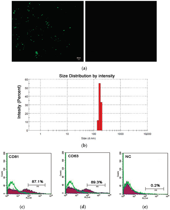 Characterization of small extracellular vesicles from adipose mesenchymal stem cells: (a) a representative immunofluorescent image of sEVs stained with CFSE (green fluorescence on left panel); (b) dynamic light scattering analysis: a representative intensity distribution graph of ASC-derived sEVs: (c–e) flow cytometry for sEV-specific markers: the histograms are representative of CD81 (c) CD63 (d) and positive cells. Cytometry control beads (e) and negative control, NC.
