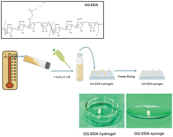 Here, the ionotropic cross-linking of the low molecular weight aqueous dispersion of GG-EDA was performed by injecting it into a 0.1 M CaCl2 solution. In this study, instead, the hydrogel was prepared by first dispersing the polymer at 6% in MilliQ water at 90 °C and directly injecting a 0.1 M CaCl2 solution. As shown in Figure 2, after ionotropic cross-linking, the hydrogel was freeze-dried, washed to remove excess calcium salt and freeze-dried again to obtain the GG-EDA sponge.