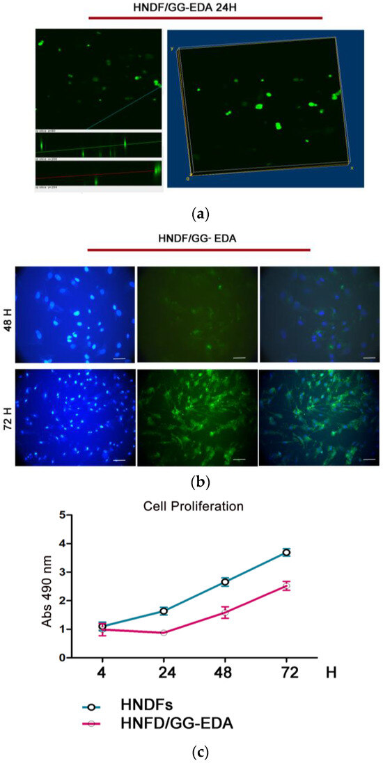 (a) Cell integration by confocal microscopy: a representative volume viewer by 3D reconstruction of HNDF at 24 h (40× magnification, scale bar: 20µm); (b) immunofluorescence microscopy exam of HNDF cells seeded in GG-EDA scaffold after 24 and 48 h (from left to right: DAPI staining, calcein AM staining and merged images); (b) cell viability: representative images of calcein AM staining of HNDF 48 and 72 h; (c) HNDF proliferation on GG-EDA compared to the control (HNDF) by MTS assay at 4, 24, 48 and 72 h. (Abs = absorbance at 490 nm). All experiments were performed in triplicate and repeated three times.