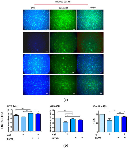 GG-EDA enriched with ASC-derived sEVs treated with cytokines (GG-EDA + sEVs + cyt) were observed under an immunofluorescent microscope after 48 h of culture. Immunofluorescence calcein AM staining suggested an improvement in the cell density in HNDF/GG-EDA + sEVs + cyt compared to HNDF/GG-EDA + cyt (Figure 5a).