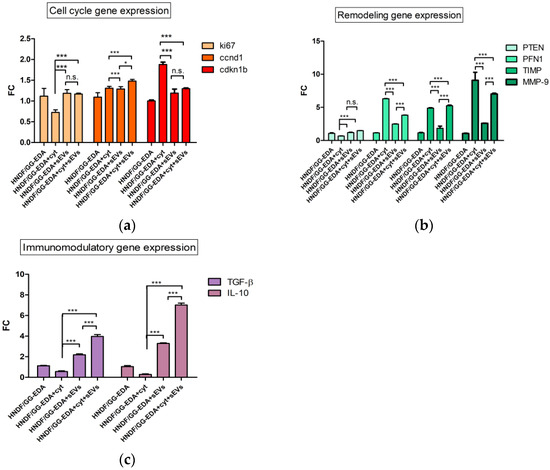 Comparative gene expression analysis of pro-inflamed HDNFs seeded on GG-EDA hydrogels with or without sEVs: (a) histogram representing gene involved in cell cycle regulation; (b) histogram representing gene involved in cytoskeleton remodeling; (c) and histogram representing gene involved in immunomodulatory response. Data are expressed as mean ± standard deviation. (* p < 0.05, *** p < 0.0001, p > 0.05 n.s.). All experiments were performed in triplicate and repeated three times.