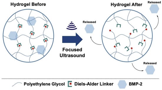 In parallel, the use of dynamic covalent chemistry, such as Diels–Alder (DA) reactions, in hydrogel crosslinking has revolutionized the design of injectable and responsive biomaterials [21,23,24,25]. DA reactions offer several unique advantages for biomedical applications, including reversibility under mild conditions, yielding the initial reactants, tunable reaction kinetics to ensure physiologically safe thermal responsivity, and synthesis methods compatible with bioactive molecules [26,27,28,29]. As a result of these characteristics, DA crosslinking enables the design of hydrogels with both structural integrity and dynamic responsivity [30,31,32]. By leveraging the synergy between ultrasound responsiveness and DA crosslinking, a new generation of PEG-based hydrogels can be designed to achieve the spatiotemporally controlled release of therapeutic agents like BMP-2.