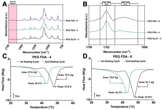 (A) Fourier transform infrared spectroscopy of final dried hydrogel matrices for PEG-FDA-4, PEG-FDA-8, and PEG-GLUT-4 from 750 cm−1 to 1750 cm−1. (B) Fourier transform infrared spectroscopy of final dried hydrogel matrices for PEG-FDA-4, PEG-FDA-8, and PEG-GLUT-4 in key area of interest between 1600 cm−1 and 1750 cm−1. (C) Differential scanning calorimetry of two sequential heating cycles from 20 °C to 60 °C with PEG-FDA-4 and (D) PEG-FDA-8.