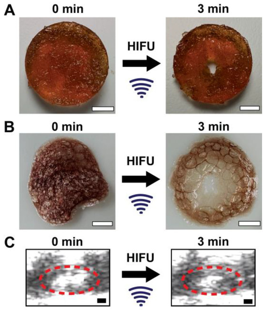 (A) An 8 mm PEG-FDA-4 hydrogel with no focused ultrasound exposure (left) and a hydrogel with 3 min of fUS exposure at 1.5 MHz with 20 ms repeated pulses at 1 Hz and p+ = 33 MPa and p- = 15 MPa (right) (scale bar = 2 mm). (B) The samples from A after being dried in a desiccator to visualize the crosslinking matrices (scale bar = 2 mm). (C) Real-time ultrasound imaging of PEG-FDA-4 before (left) and after 3 min of focused ultrasound (right), where the white space inside the red circle is the entirety of the PEG hydrogel (scale bar = 2 mm).