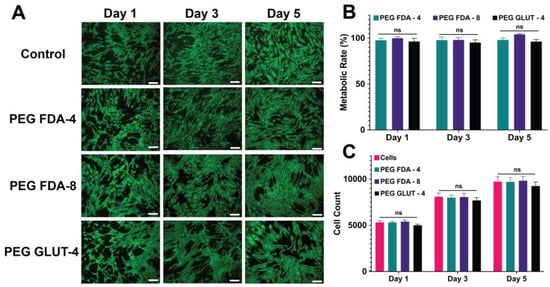 The initial reactants for PEG-FDA-4 included four-arm PEG-furan and four-arm PEG-maleimide, while the initial reactants for PEG-FDA-8 included eight-arm PEG-furan and eight-arm PEG-maleimide. Cell media containing the respective focused ultrasound-induced PEG hydrogel degradation byproducts were used to assess the cytocompatibility of dienes and dienophiles in vitro. The metabolic rate, total cell count, and cell viability were evaluated (Figure 4). BMSCs were assessed in culture with a medium containing a 10% w/v ratio of degradation products (PEG-FDA-4, PEG-FDA-8, and PEG-GLUT-4) and then compared to BMSCs in culture with media not containing PEG hydrogel byproducts. DA PEG hydrogels did not show cytotoxic effects during exposure to BMSCs in vitro. When compared to a no-PEG hydrogel control group with only cells, no visible difference was seen in the LIVE/DEAD images of DA hydrogels (Figure 4A). Similarly, as shown in Figure 4B, there were no significant differences in the metabolic rate shown in the PEG-FDA-4 and PEG-FDA-8 groups when compared to the BMSC control (100%). There were also no significant differences shown in the cell count for PEG-FDA-4 and PEG-FDA-8 when compared to the BMSC-only control (Figure 4C). The control group PEG-GLUT-4 also exhibited no visible differences in any of the LIVE/DEAD images, as well as no significant difference in the metabolic rate or cell count (Figure 4). This was to be expected due to PEG’s high biocompatibility as described in the literature [12,49].