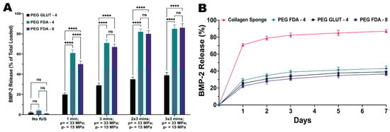 (A) Hydrogels loaded with BMP-2 underwent fUS exposure under the parameters of 1.5 MHz and a 20 ms pulse length with a peak positive pressure of 33 MPa and peak negative pressure of 15 MPa. Hydrogels were exposed to targeting once for 1 min and 1, 2, and 3 times for 3 min (n = 5, ns = no significance, **** = p < 0.0001). (B) Hydrogel matrices were compared to a collagen sponge through an immersion study over a 7-day period at 37 °C to measure the retention of BMP-2 (n = 5). Statistics for the retention study can be found in Appendix A.