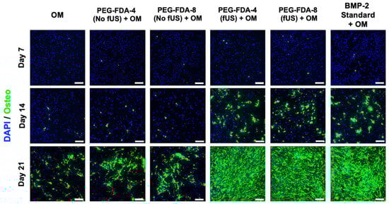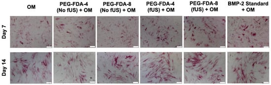BMSCs were cultured in an incubator at 37 °C with 5% CO2. Assays were then performed in 24-well transwell plates seeded at 5000 cells per well and measured at days 7 and 14 for the alkaline phosphatase (ALP) activity and 7, 14, and 21 days for the OsteoImage mineralization. All 6 groups of BMSCs were cultured in an osteogenic medium, or OM. Following the ultrasound-stimulated release from hydrogel groups, the BMP-2 concentration was standardized to 100 ng/mL and compared to a stock solution. Then, in a transwell model, the PEG-FDA-4 and PEG-FDA-8 hydrogels were submerged in media and allowed to elute BMP-2 over a 2- or 3-week period dependent on the assay length. Groups listed as “No fUS” were allowed to elute with no additional stimulation, while the fUS hydrogel groups contained the released 100 ng/mL injected into the transwell.
