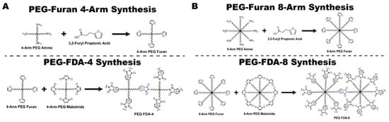 (A) Synthesis of 4-arm PEG-furan and PEG-FDA-4 via furan–maleimide-based Diels–Alder. (B) Synthesis of 8-arm PEG-furan and PEG-FDA-8 via furan–maleimide-based Diels–Alder.