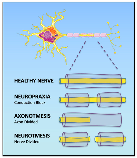 Schematic representation of Seddon’s classification of peripheral nerve injury. This figure was generated using Servier Medical Art. The selected artwork (cell shown in the figure) was taken or adapted from pictures provided by Servier Medical Art (Servier; https://smart.servier.com/, accessed on 15 January 2025), licensed under a Creative Commons Attribution 4.0 Unported License [14].