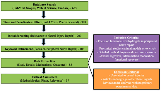 For this review, a comprehensive literature search was conducted across PubMed, Scopus, Web of Science, and Embase to identify recent advancements in peripheral nerve repair using functionalized hydrogels. Keywords such as “functionalized hydrogels”, “neural injury repair”, “peripheral nerve regeneration”, and “biofunctionalized hydrogels” were employed. The search was restricted to peer-reviewed journal articles published within the last four years to ensure current relevance. The inclusion criteria targeted studies investigating functionalized hydrogels in peripheral nerve repair, with a focus on preclinical models (animal or ex vivo). Eligible studies provided detailed methodologies, including hydrogel composition, functionalization techniques, and effects on neural repair. Outcome measures such as axonal regrowth, inflammation modulation, or functional recovery were prioritized. Exclusion criteria filtered out studies unrelated to neural injuries, non-English publications, and reviews or meta-analyses lacking primary data. Key data were extracted from the selected studies, including publication details, study design, hydrogel types, functionalization strategies, mechanisms of action, and outcomes related to nerve regeneration. Specific emphasis was placed on the impact of hydrogel functionalization on axonal growth, neuronal survival, immune modulation, and scaffold integration within the injury site. The methodological rigor of the included studies was critically assessed (Figure 2).