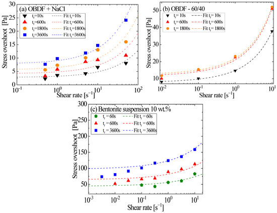 - Andrade, D.E.V.; Fernandes, R.R.; Santos, T.G.M.; Ceccon, E.V.; da Cruz, A.C.B.; Franco, A.T.; Negrão, C.O.R. Curve-Fitting Equation for Prediction of the Start-up Stress Overshoot of an Oil-Based Drilling Fluid. J. Pet. Sci. Eng. 2016, 146, 902–908. [Google Scholar] [CrossRef]
