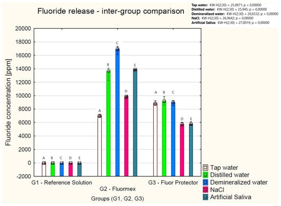 After 48 h of incubation with the Fluormex gel, the concentration of F− (in ppm) was 7035 [6899–7100] in tap water, 13,666 [12,570–13,900] in distilled water, 16,917 [16,582–17,090] in demineralized water, 9893 [9541–9893] in NaCl, and 13,896 [13,896–13,908] in artificial saliva. A significantly lower concentration of F− was found in the Fluormex tap water solution (G2) compared to distilled water (p = 0.006) and demineralized water (p = 0.0000). Additionally, the Fluormex solution with demineralized water contained a higher concentration of F− than the solution with NaCl (p = 0.0000).