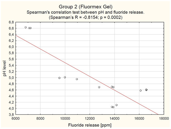 In the G2 (Fluormex) group, a clear inverse relationship was observed, where lower pHs corresponded to greater fluoride release. At the highest pH (6.62 ± 0.01), the fluoride release was 7035 [6899–7100] ppm, while at the lowest pH (4.07 ± 0.04), it peaked at 13,896 [13,896–13,908] ppm (Spearman’s R = −0.8154; p = 0.0002; see Figure 3).