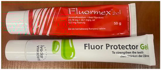 Studies were conducted on two commercially available fluoride gels: Fluormex (CHEMA-ELEKTROMET, Rzeszów, Poland) and Fluor Protector Gel (Ivoclar Vivadent, Schaan, Liechtenstein). Used products are depicted in Figure 4. Used products are depicted in Figure 4 (Photo taken by M.D. in Department of Pediatric Dentistry and Preclinical Dentistry, Wroclaw Medical University, for academic research only).