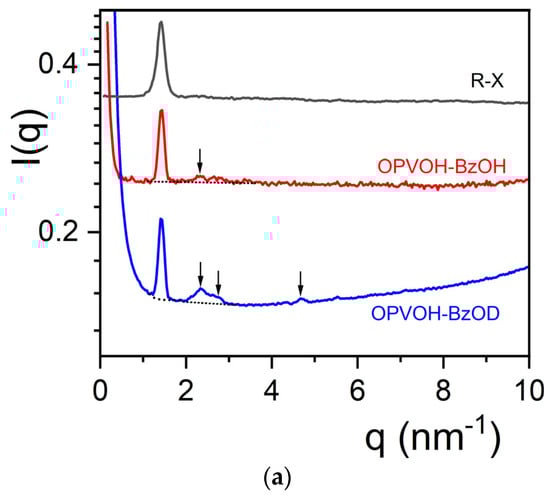 There is a significant difference between the diffraction patterns recorded by X-ray and by neutrons for the OPVOH/benzyl alcohol systems, as seen in Figure 3a. While there is only one peak at q = 1.405 nm−1 for the X-ray pattern, other peaks appear in the neutron patterns. A weak peak is seen for OPVOH/BzOHH at q = 2.329 nm−1, compared to three additional peaks for OPVOH/BzOHD at q = 2.329 nm−1, q = 2.79 nm−1, and q = 4.672 nm−1 (see Table 1). Miller indices are assigned to the peaks by taking the π-π stacking direction as the c-axis (Table 1). The relative intensities of the neutron diffraction peaks for each system, I(qi) in %, are calculated by
