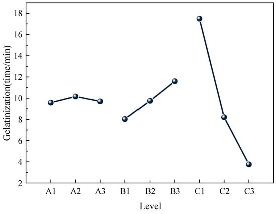 According to the results of orthogonal experiments, the effects of different factors and levels on the gel forming time were statistically analyzed, and the effects of each factor level on the gel forming time are shown in Figure 1. The results of the significance analysis of each factor are shown in Table 3.