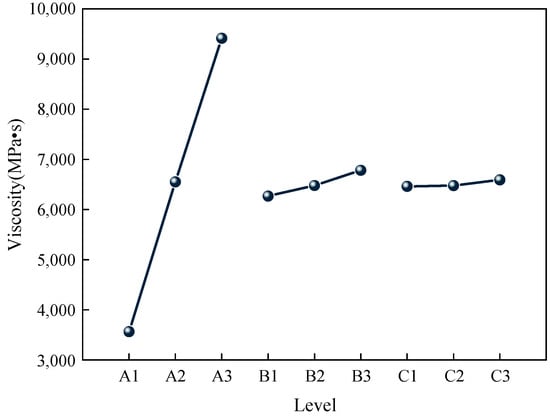 According to the results of orthogonal experiments, the effects of different factors and levels on the viscosity of the gel were statistically analyzed, and the effects of each factor level on the viscosity of the gel are shown in Figure 2. The results of the significance analysis of each factor are shown in Table 5.