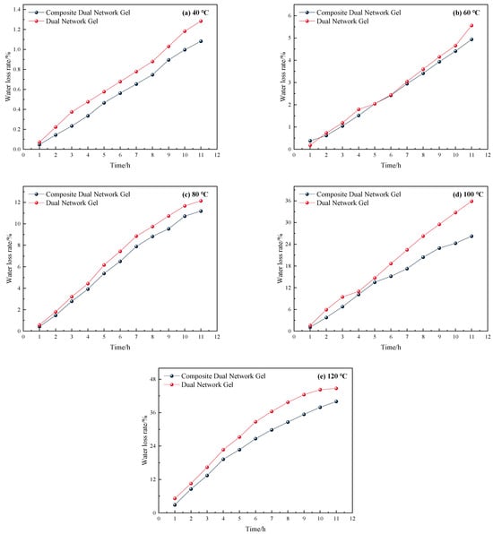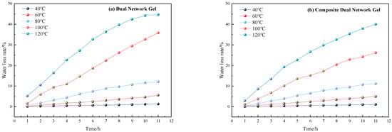 As illustrated in Figure 3, the water loss rate of both gels remained relatively stable and low, below 10%, when the temperature was below 100 °C, with only a slight increase. However, when the temperature reached 100 °C, the water loss rate increased rapidly, reaching approximately 40% after 12 h. The water loss rate changes of the two gels under constant temperature heating at 120 °C are illustrated separately in Figure 4.