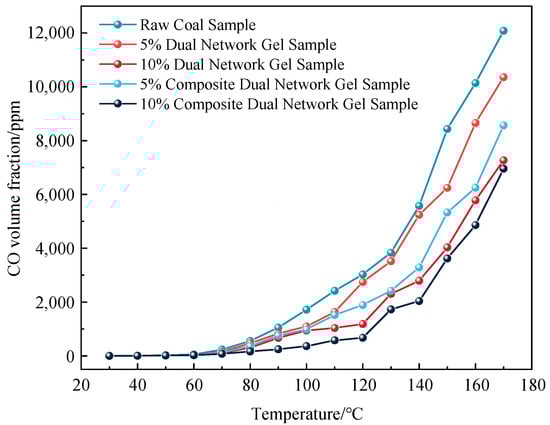 As illustrated in Figure 5, the CO volume fraction of all five groups of samples increased exponentially. The addition of both gels slowed the low-temperature oxidation of coal and demonstrated a strong inhibitory effect on spontaneous combustion. This inhibition effect was notably enhanced with the increase in gel content. Overall, the composite dual-network gel with the metal ion inhibitor exhibited a significantly better inhibitory effect than the standard dual-network gel without the inhibitor. The observed effects can be attributed to two factors: first, the addition of metal ions increases the crosslinking density of the gel, enhancing its adhesion to the coal and reducing the oxygen supply needed for spontaneous combustion. Second, the high-temperature decomposition of magnesium chloride generates chlorine and other inert gases, which help disrupt or interrupt the combustion chain reaction, thereby inhibiting the combustion process. The incorporation of 5% and 10% metal ion inhibitor composite dual-network gels into the dual-network gel reduced the release of CO by 20.21% and 4.64%, respectively.