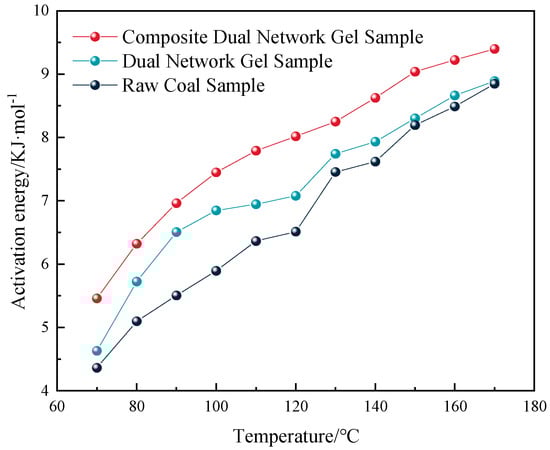 As illustrated in Figure 7, throughout the warming process, compared with the original coal group, the activation energy of the oxidation reaction for coal samples treated with different gels showed varying degrees of enhancement, with increases of 9.8% and 23.4%, respectively. This indicates that the gel material increased the activation energy required for the coal spontaneous combustion reaction, making it more difficult for such a reaction to occur. The composite dual-network gel exhibited a better inhibition effect compared with the dual-network gel.