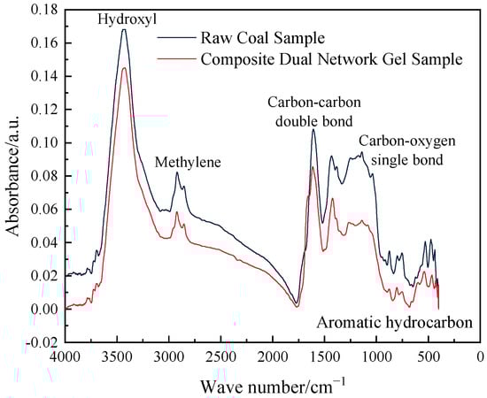 The coal samples treated with water and the composite dual-network gel were dried at 30 °C for 48 h, while potassium bromide was dried at 105 °C for 3 h. The samples were then pressed. The experimental test wave number range was 4000–400 cm−1, and the sample scanning frequency was set to 32 scans per second. The infrared spectra of the two groups of samples were then tested. The error of infrared spectroscopy was in the range of 1 absorbance.