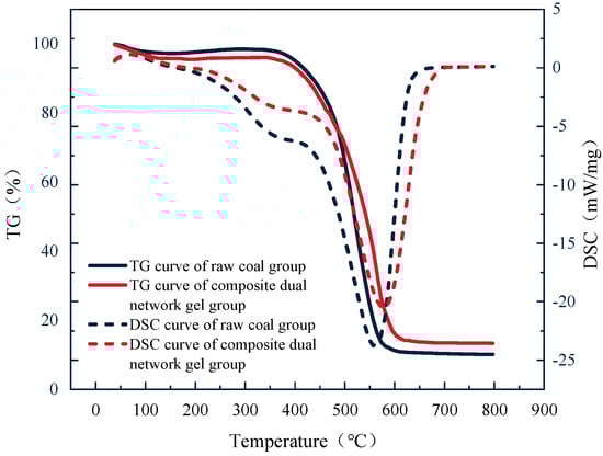 TG-DSC curve of raw coal and composite dual-network gel-treated coal samples.